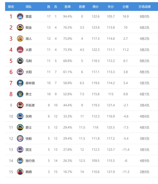 今日比赛后掘金、湖人排名互换,国王、独行侠排名互换,其他西部球队排名不变。